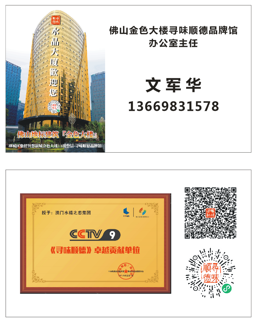 背景墙上的“寻味顺德”印章,直接点明了空间的饮食文化主题。顺德是“世界美食之都”,这个标识表明这里很可能是一家主打顺德风味的餐厅或私房菜馆的接待区。