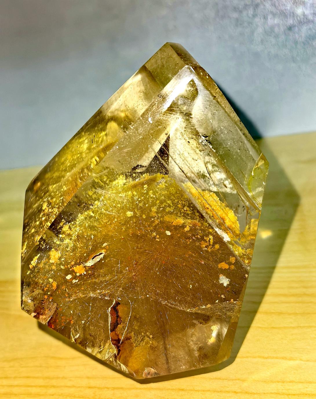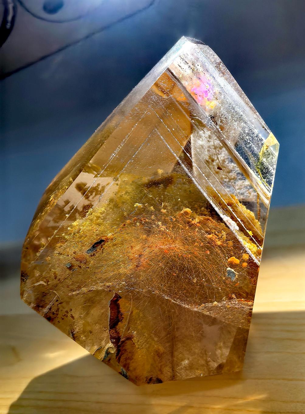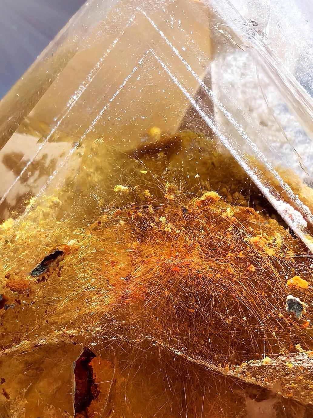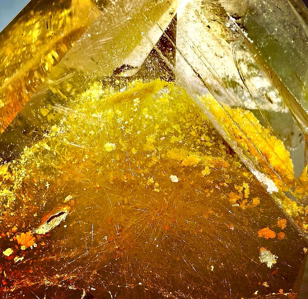 · 科学成因:“金发晶”的“发丝”通常是包裹在水晶内部的针状金红石(二氧化钛)。这些金红石晶体仿佛被冻结的水中,其分布决定了画面的动感。