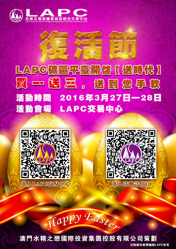 LAPC複活節·送時代/買一送三活動 活動時間 2016年3月27日—28日 活動會場 LAPC交易中心 LAPC承諾 LAPC交易中心支持7天無理由退換貨,LAPC將以售出價回購或更換等價貨品,請放心選購。