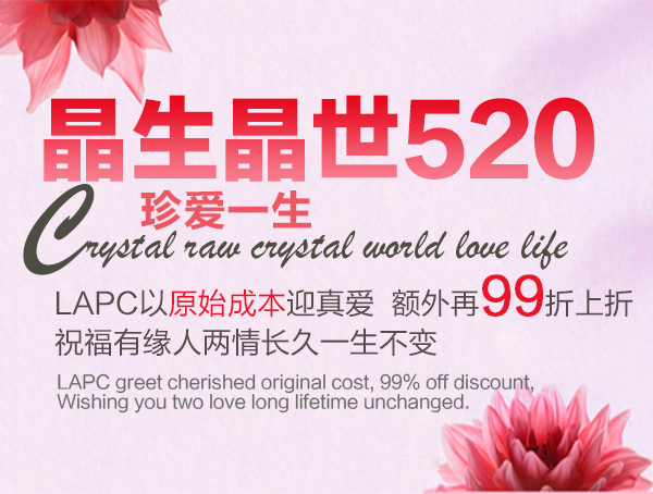 520珍爱节,又适逢周末会员日,在水精宫殿大众晶品节暨疯狂淘宝周活动大背景下,LAPC交易中心线上以原始成本迎真爱,额外再献爱1%,相当于裸价基础上再9.9折,以此举祝福天下有缘人两情相悦长长久久。