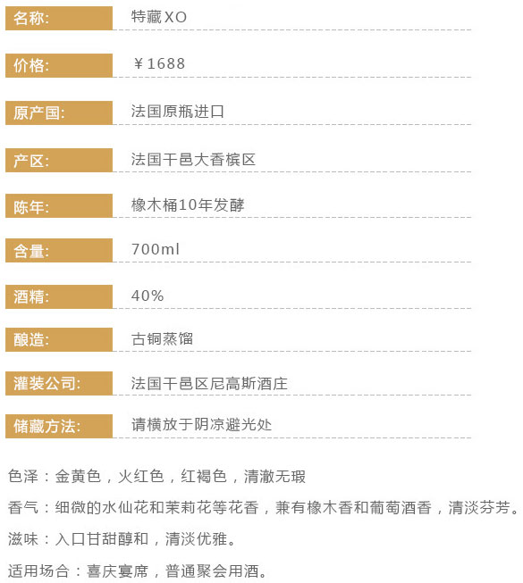 法国XO-10年干邑,橡木桶10年发酵,总共超过15年窖藏