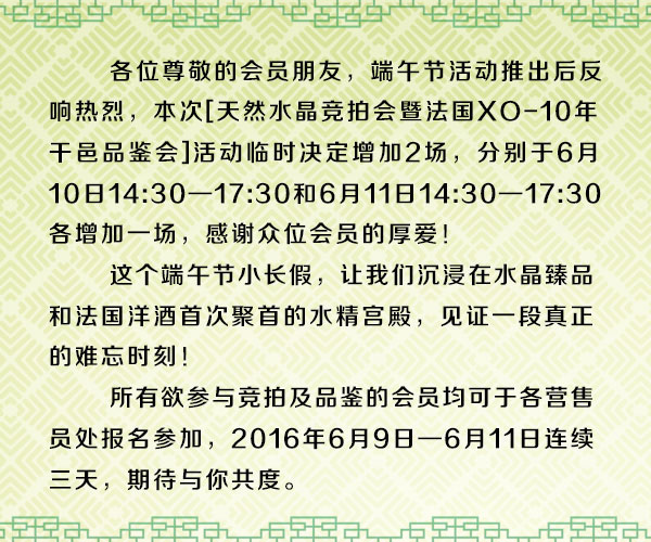 本次竞拍会诚邀50名至尊会员莅临,请您在收到与会邀请函后尽速报名,受邀会员当日免费就餐,可携家人/小朋友一同前来,我们为他们也准备了精彩的节目。