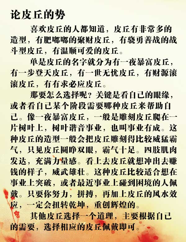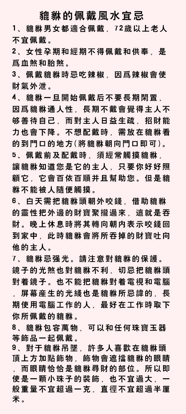 皮丘是招財聖物,關於皮丘功能已不用多作介紹,這裡將皮丘佩戴的風水宜忌簡要列舉如下,請各位參考。