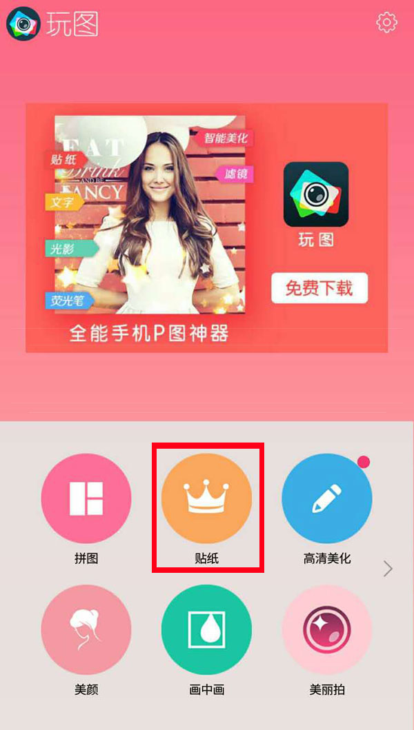 打开玩图软件,点击“贴纸”按钮(红框所示)