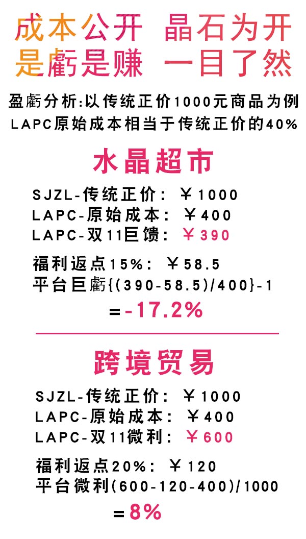 传统正价3.9折,低于成本1个点,还要返利15个点,相当于成本以下巨虧17.2%,只为双11,LAPC真的做到了!巨馈当赢,以表决心,彻底脱光,明益街坊!