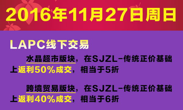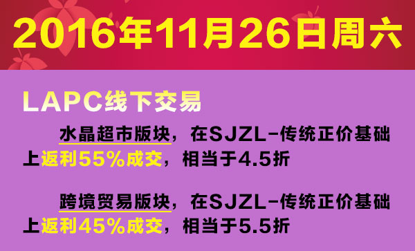 说明:在11月26-12月1日期间,线下交易仍与线上交易价格同步,区别之处在于线下不享受线上会员分销商福利返点。