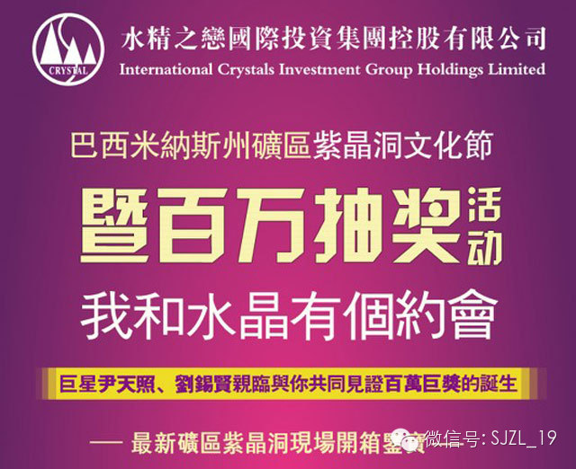 10月5日,澳门水精之恋集团在顺德水精宫殿举行巴西米纳斯州矿区紫晶洞文化节暨百万大抽奖活动,特邀香港影视明星尹天照、刘锡贤亲临现场,与您共同见证百万巨奖的诞生。同时还有巴西矿区紫晶洞现场开箱,即开即选,让您领略到矿区水晶的魅力。