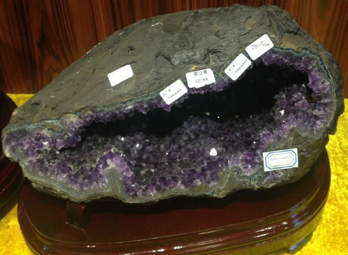 【产品介绍】 紫晶洞古称雷公蛋,是佛教七宝之一,具王者的「尊贵之气」,是重要的风水宝物。 紫水晶洞是含有二氧化硅的地下水从边缘慢慢渗透进玛瑙洞里凝聚、结晶形成的。一般我们所见到的紫晶洞都有三层,最内层是紫水晶晶粒、中间层是玛瑙,最外层是工人加上的水泥保护层。同外放型、放射状的白水晶簇水晶不同,紫水晶洞是内敛型、聚合状的能量体,使它在风水运用上可以轻易做到聚散、收放自如的聚气化煞,招财进宝的作用。
