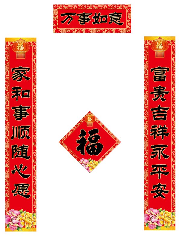 春联是人们抒发新年愿望和憧憬的特有方式,是华人春节的重要标志,形式如下: