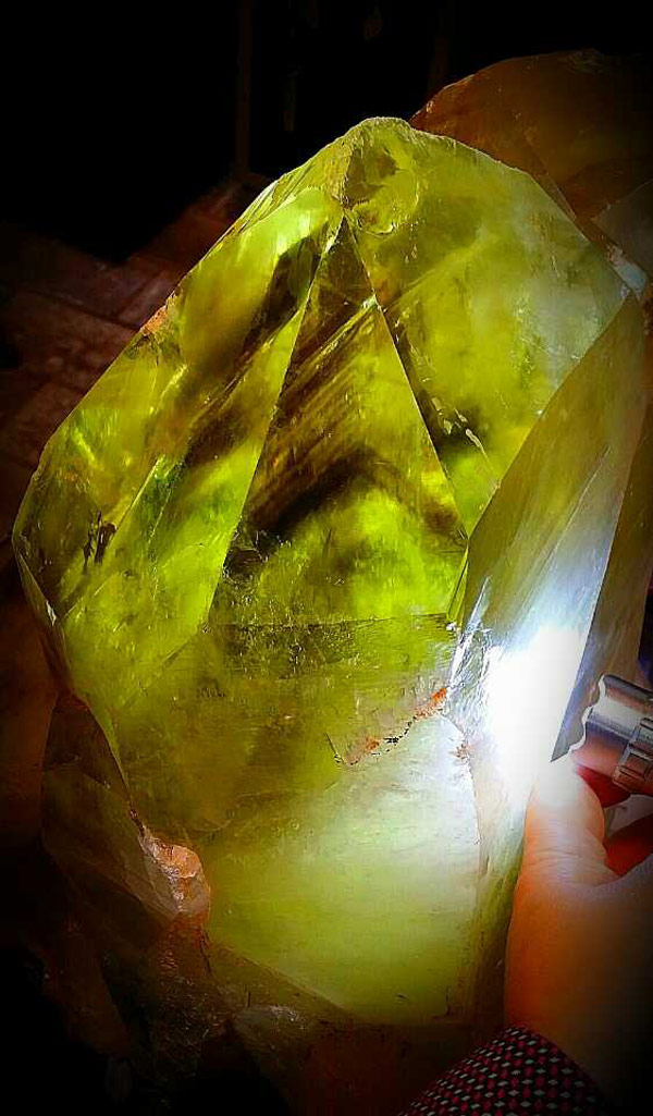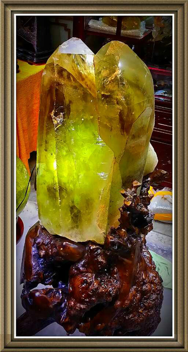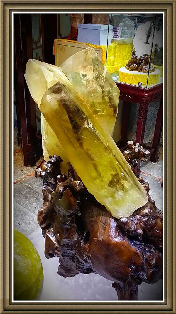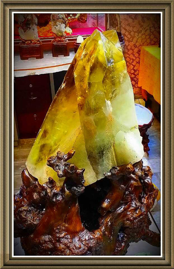 水精宮殿:截止目前全球最大的雙晶體黃晶原礦柱標本終於運到水精宮殿,礦標近六十公斤,生長期大約四億年,不同角度看大自然造型可謂千奇百怪、精彩纷呈,時而似金字塔雄壯威武,時而似情侶相依相偎,時而似母親懷抱嬰兒,時而似擎天柱橫財就手!特别是內景圖騰,富貴千層塔中求,彩虹滿天萬戶侯。
