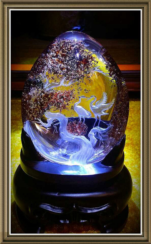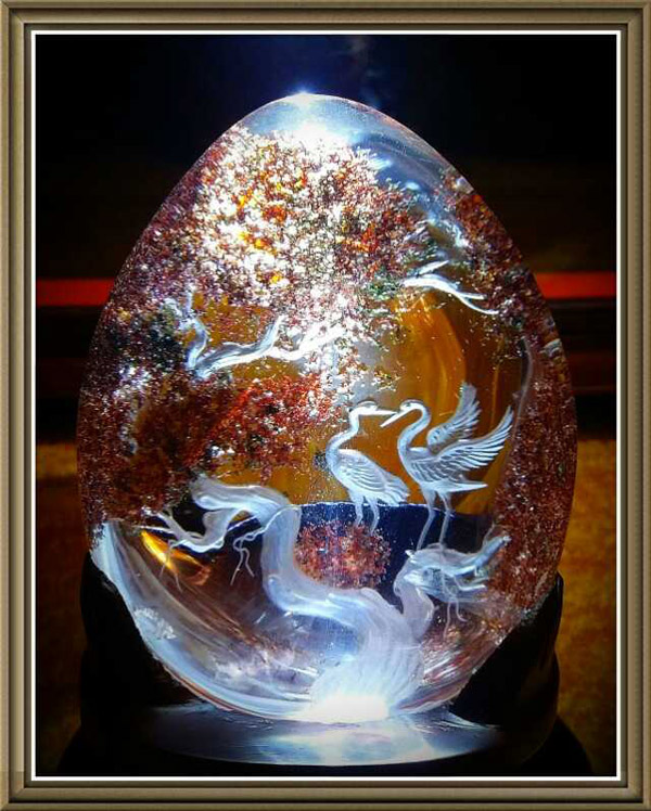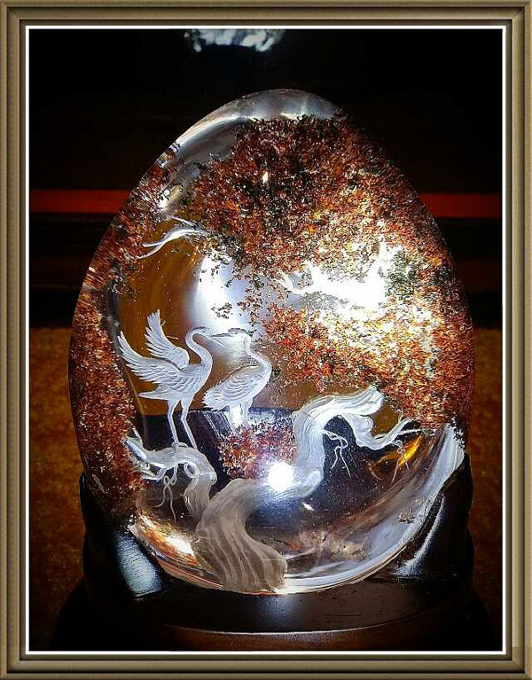 天然內景內雕奇石鑒賞:最有趣的是第一幅,無心的光影投射,營造出仙鶴巢中的仙鶴蛋之幻影效果,天然水晶中的火山灰(綠泥石)包裹體結合內雕大師巧奪天工的雕刻技藝,用天人合一之鬼斧神工展現出一段美侖美奐的晶世之作!