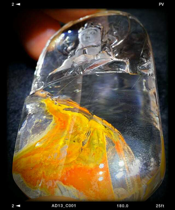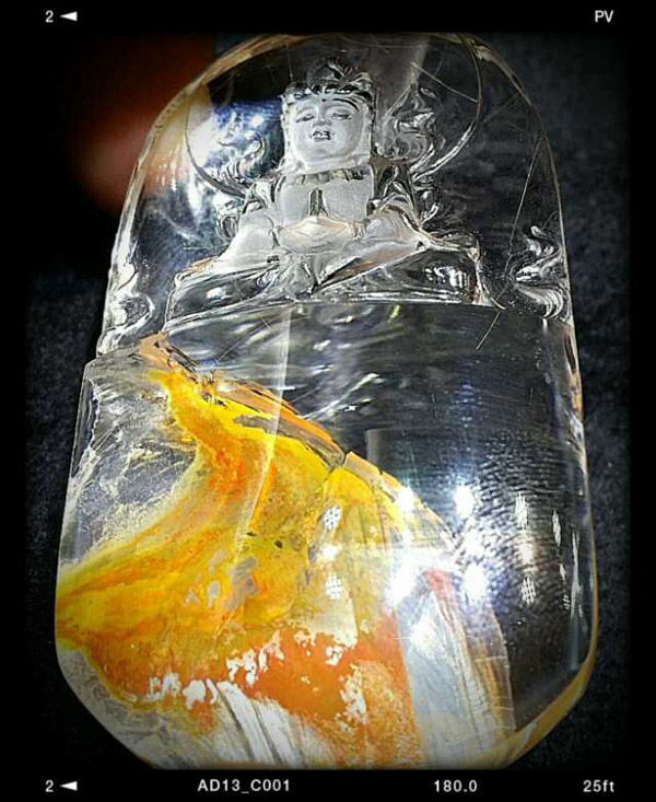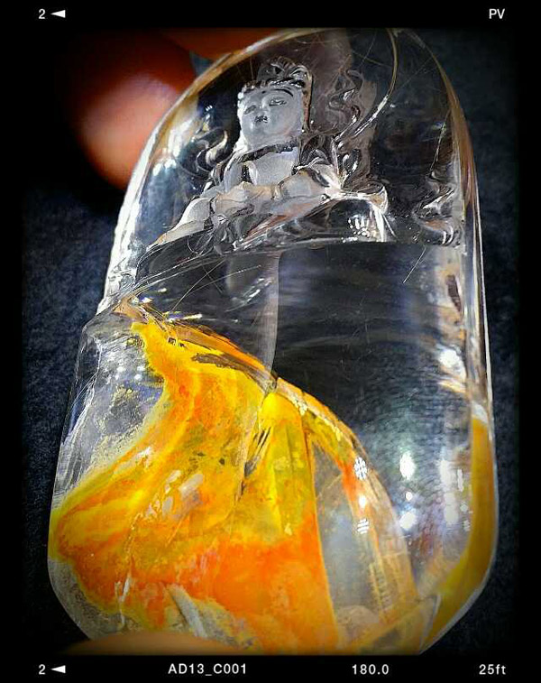 水晶大王鑒賞會:极其罕見的金發晶黃絞花水晶礦精雕菩萨掛牌,也是經典的天然內景奇石魁首之作!浴火重生,鳳凰涅槃,在烈火中永生的畫面讓人內心無比震憾,屏息觀賞,鳳鳳的頭颅高仰著向著佛界,烈焰中振翅高飛,血与羽毛融合在生与重生的熾熱中,很難用語言去表达內心的瘋熱和贊嘆!