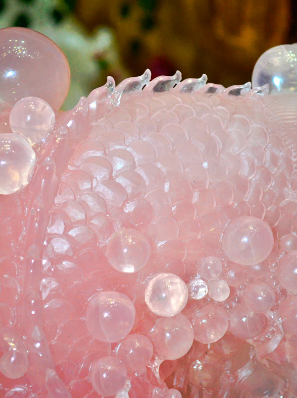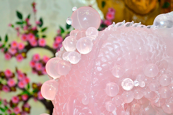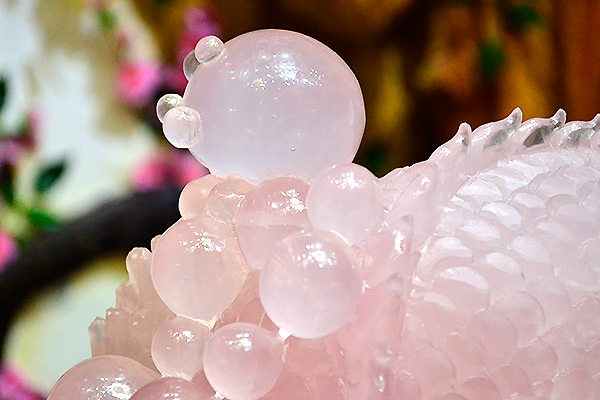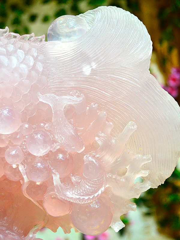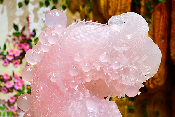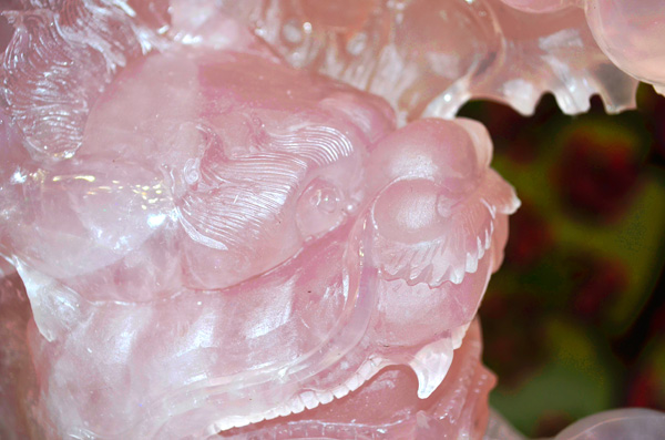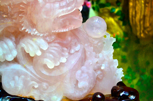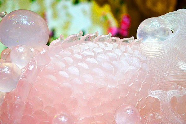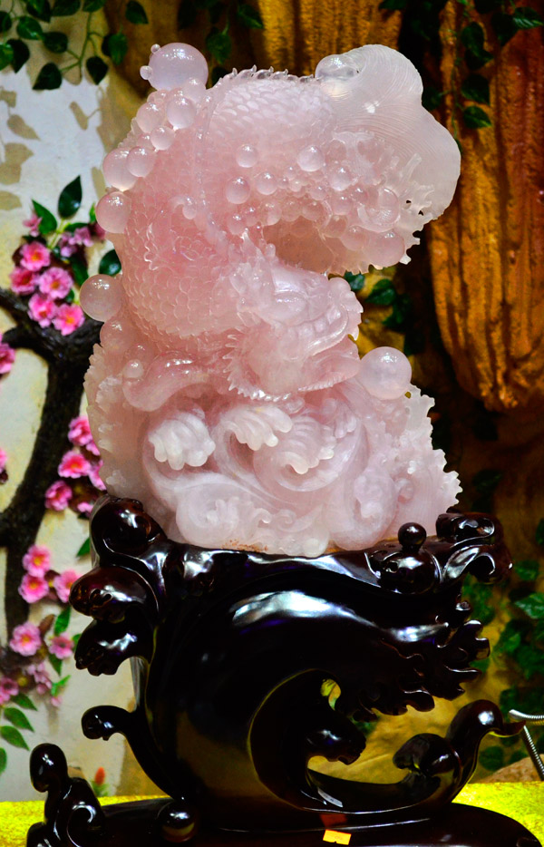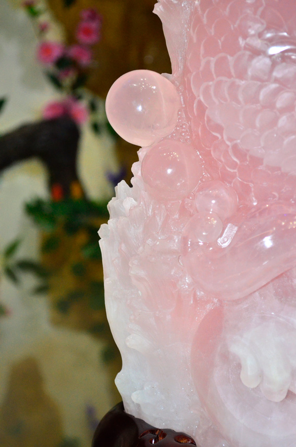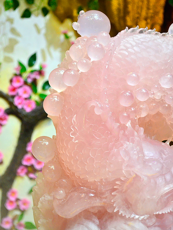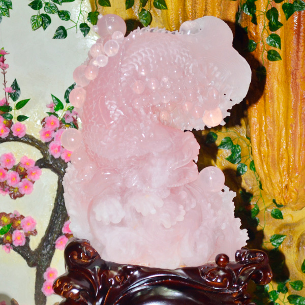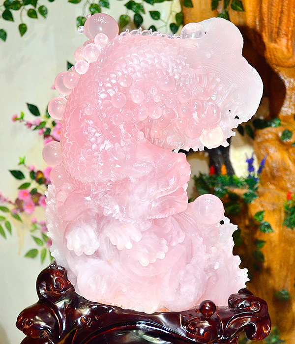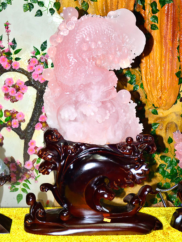 庭栽栖凤竹,池养化龙鱼。如果家里有一处“鱼跃龙门”的景致,别提有多兴旺了,锦鲤在跃过龙门之后即化为蛟龙,从此上天入地呼风唤雨,一幅飞龙在天的景象。这款“鱼跃龙门”粉晶精雕件就是有如此美好寓意的室内摆件,冰粉怡人,如璧似玉。