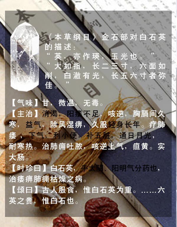 02.《中药大辞典》载;水晶,甘温,入肺,肾,心经。功用主治:温肺肾,安心神,利小便,治肺寒咳嗽,阳痿,消渴,心神不安,惊悸善忘,小便不利,黄疸,石水,风寒湿痹等。
