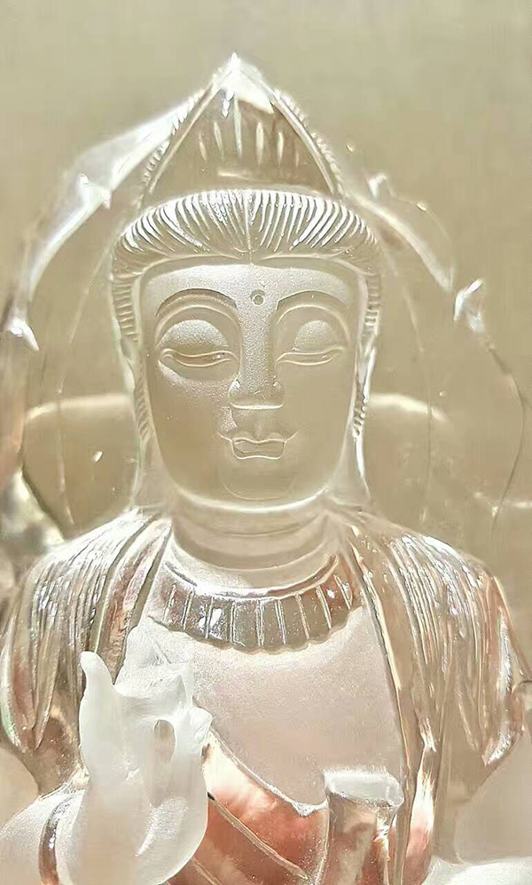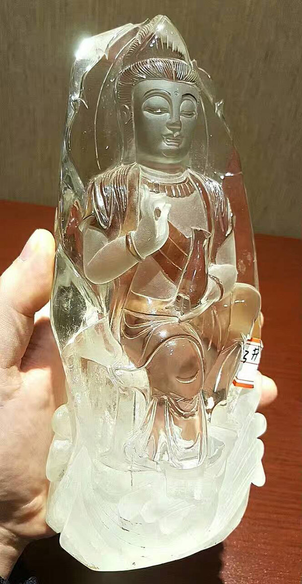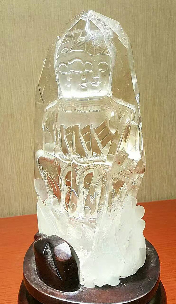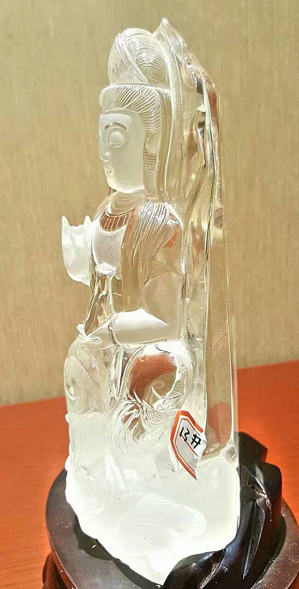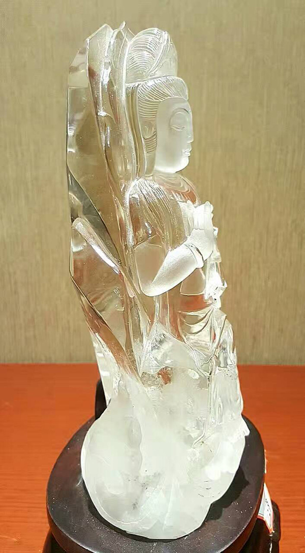 「南海觀世音菩薩」,巴西冰種白水晶寶礦料,雖不是大師之作,但也是資深老師傅的作品,雕了一輩子的觀音菩薩,把靈性給刻劃出來了,雖然不是頂級收藏品但也是極好的供奉之尊!
