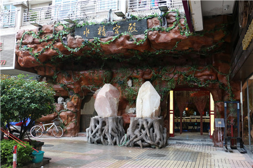 高端大气的宫殿门口,8吨巨型水晶石坐阵更显威武