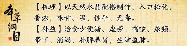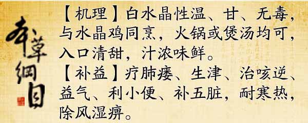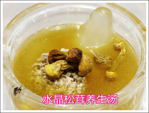 除了古法水晶鸡外,还有水晶鱼、水晶牛羊猪肉、水晶生鲜等;水晶养生菌菇、水晶时蔬;水晶养生汤煲、水晶火锅、水晶烧烤;水晶糕点等等特色水晶菜式。水晶膳食均以《本草纲目》为研发依据,继承其养生原理、改良其烹饪方法,形成了古今结合、传统与现代相结合的独特美食。