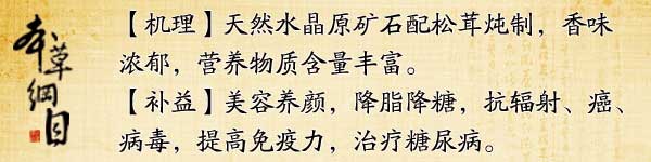 水晶鸡是其主打的古法养生美食,根据《本草纲目》中记载的饲养方法,放养于粤北山区,以玉米混合水晶矿砂为饲料,吸收水晶矿物中丰富的营养成分,改善鸡肉肉质,增强其滋补功效。