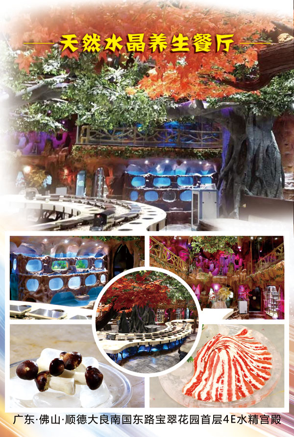 水晶养生餐厅是全国首家以天然水晶文化及水晶养生膳食为主题的餐厅,是《寻味顺德》的拍摄基地,坐落于水精宫殿首层。