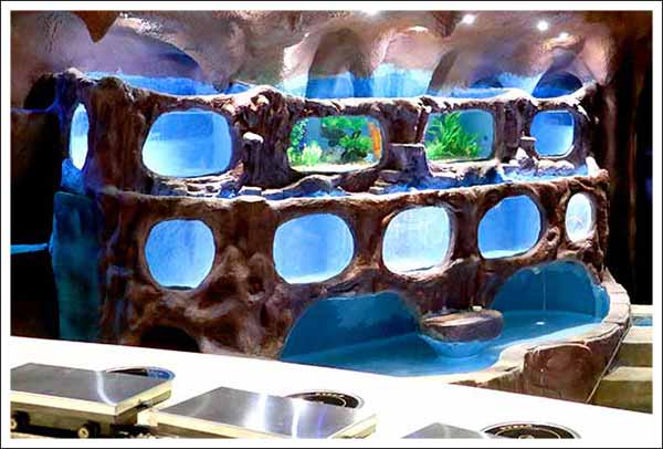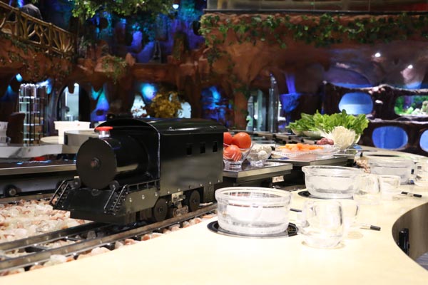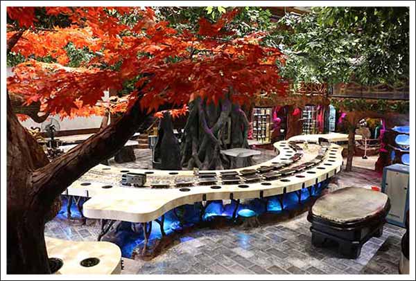 就连火车送餐、影音墙幕、自助烧烤台、贵宾厢房、水晶鱼池、水晶厨房,采用全水晶形式装修,极致拓展水晶使用场景、发挥天然水晶文化优势。