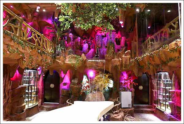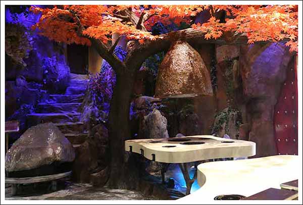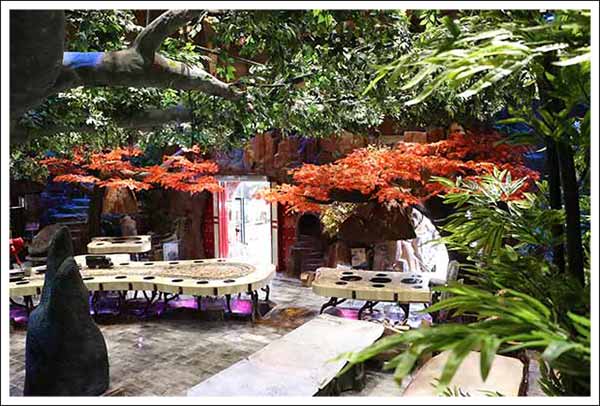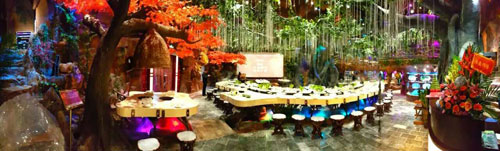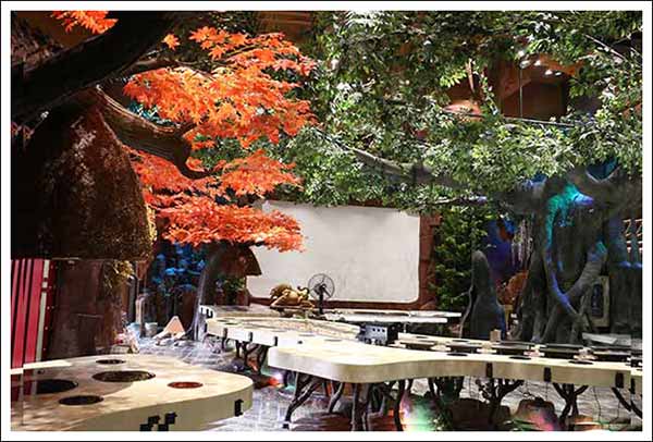 天然水晶餐厅景致奇伟瑰丽,深刻还原巴西原始矿洞奇景,重峦叠嶂曲水飞瀑,茂林修竹锦鳞彩帐。融险峻奇幻于一体,宏伟磅礴,古木参天,又伴小桥流水,移步换景,仿若绿野仙踪。似精心雕琢,却又浑然天成。