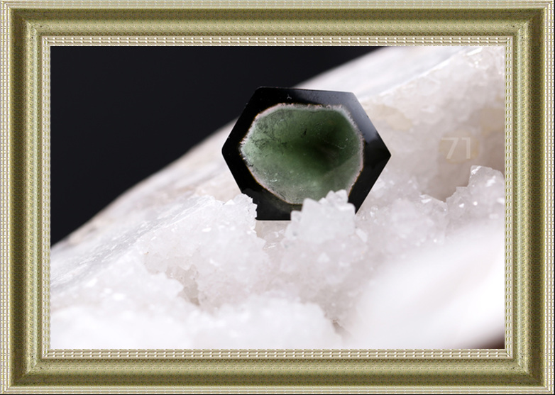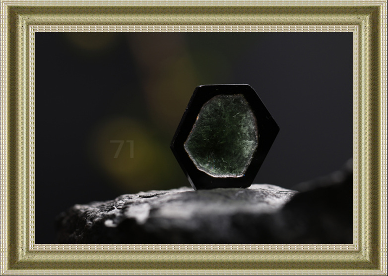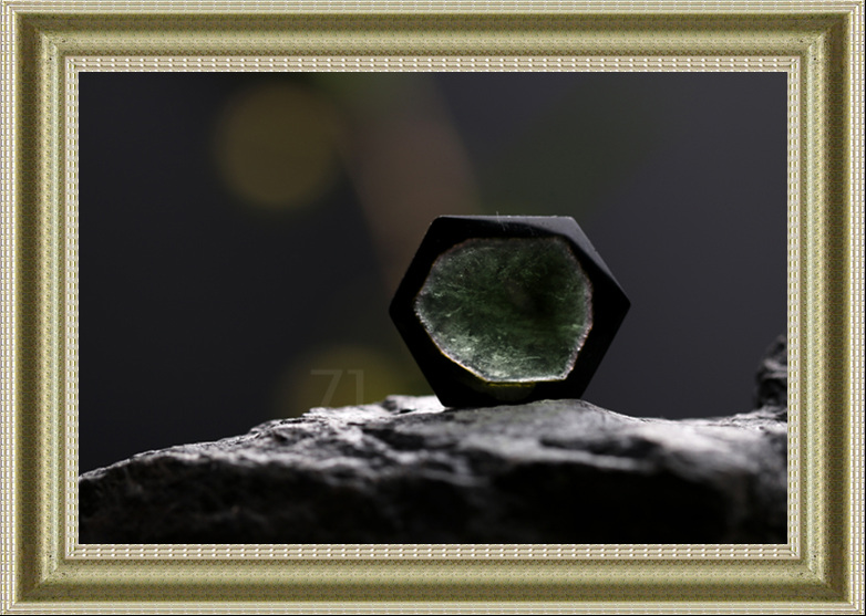 六边体形状的蓝绿碧玺中间有一个神秘的“洞”,洞里布满了“水草”,表面仿佛有一层结界隔开了两个世界。