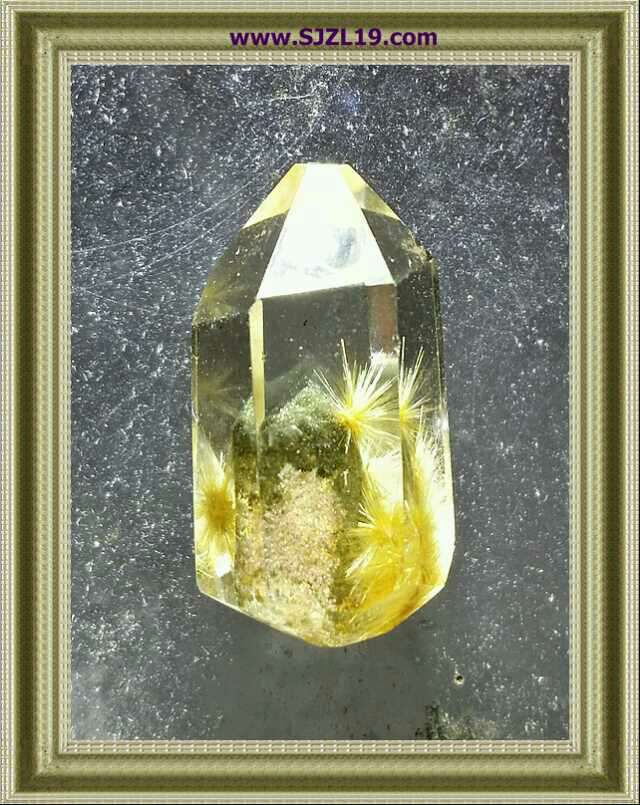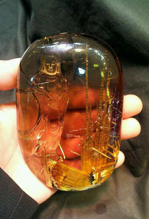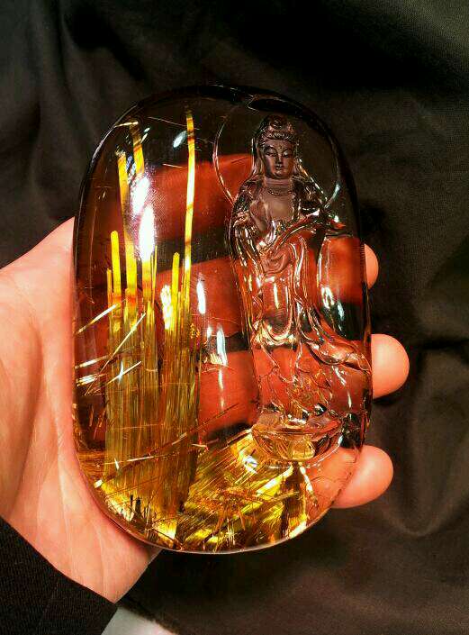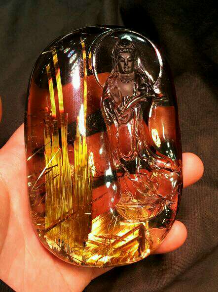 金香敬佛:极品板金钛晶,晶体内的钛晶丝粗而密集,像一注金香,献给观音菩萨。