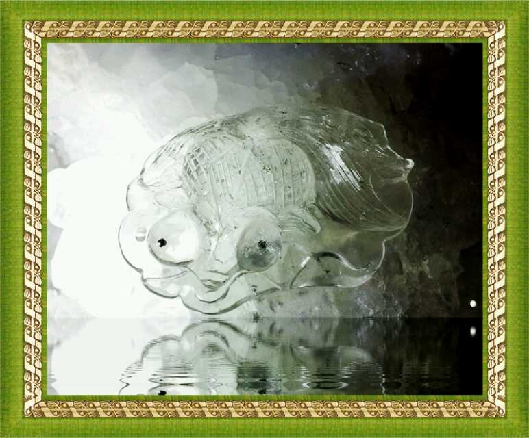 冰種白晶礦體,內含兩粒電氣石晶中晶包裹體,大師巧妙構思,妙筆生花,將兩粒電氣石當做魚眼珠子,以眼爲魂,晶體爲魄,天人合一,精雕細刻,栩栩如生的“金(晶)魚放生圖“宛如渾然天成,晶彩絕倫