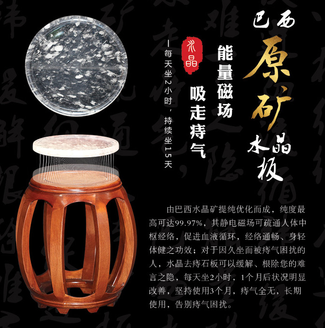 巴西原矿去痔水晶板,由巴西水晶矿提纯优化而成,纯度最高可达99.97%,其静电磁场可疏通人体中枢经络,促进血液循环,经络通畅、身轻体健之功效;对于因久坐而被痔气困扰的人,水晶去痔石板可以缓解、根除您的难言之隐,每天坐2小时,1个月后状况明显改善,坚持使用3个月,痔气全无,长期使用,告别痔气困扰。