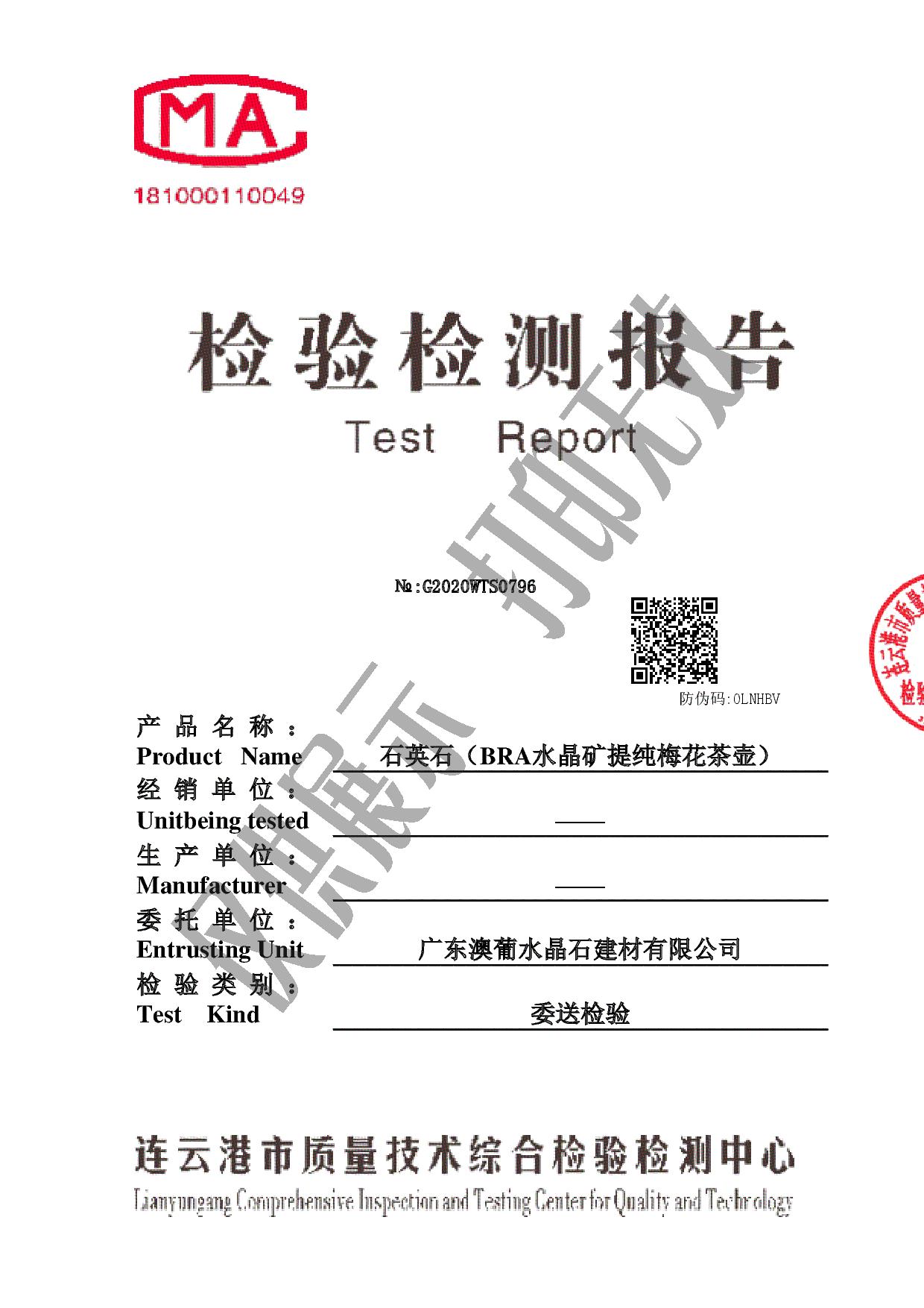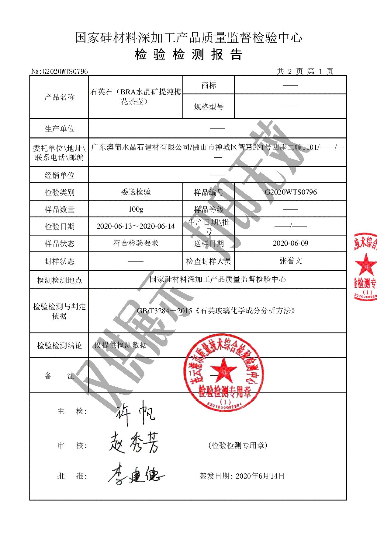 巴西水晶矿提纯优化茶壶国家硅材料检验报告
