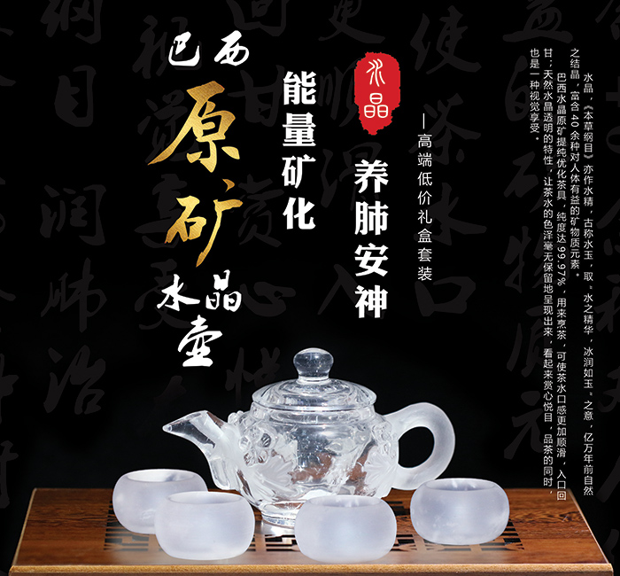 水晶原礦中富含40餘種對人體有益的礦物質元素,烹茶過程中礦物質元素與茶水融合,使茶水不再苦澀,同時口感順滑綿軟,甘之如飴,長期飲用,可補充人體必需的微量礦物元素。