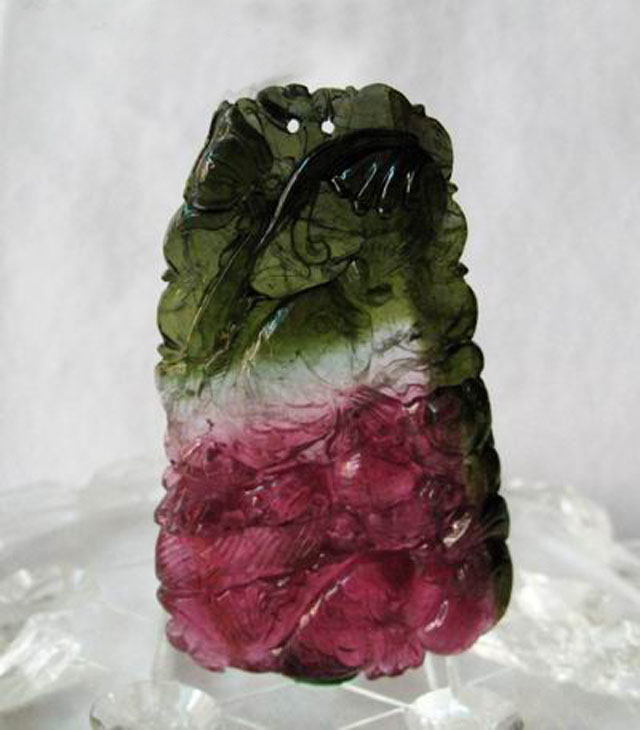 西瓜碧玺的颜色“垂直”于晶体C轴,从垂直的C轴来看,西瓜碧玺的外圈是一个颜色,内圈又是另一个颜色,看起来就像是西瓜的切面。西瓜碧玺的内含物与纹理较多,常用做雕件,因此,它的价格一直较为便宜,多以克或件计价。